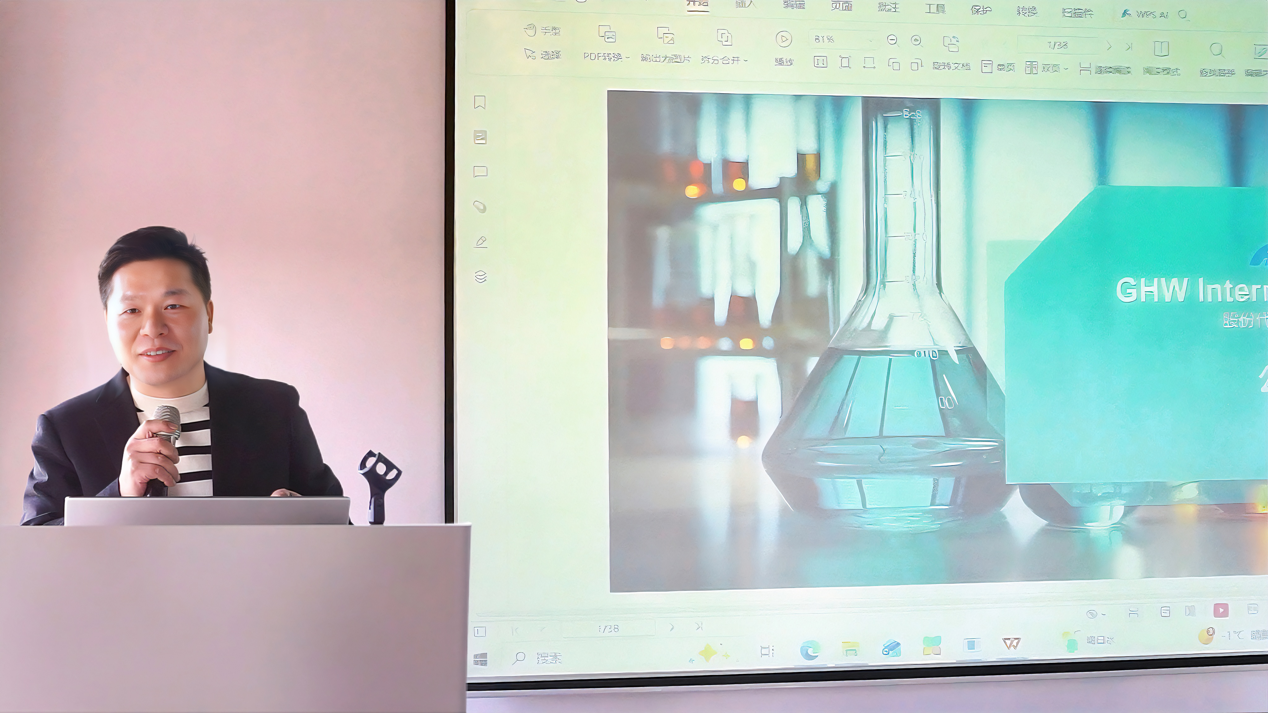 午餐后,银丰环球CEO黄嘉丰先生围绕全球经济新格局与香港资本市场分享洞见,为企业发展提供战略参考。汉威集团CEO孙桂彬先生随后介绍了GHW及汉威集团相关发展情况,与会嘉宾在其引领下参观了汉威展厅,沉浸式观摩氯化胆碱、碘衍生物系列等全球领先“拳头产品”,感受国家级“小巨人”企业深厚的实业底蕴与硬核技术实力,随后前往厂区进行实地参观。